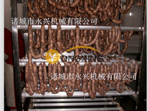 4、發(fā)煙系統(tǒng):上部為鋸沫箱,由減速機帶動攪拌機構(gòu),鋸沫周期地送與下部發(fā)煙爐盤的電熱器,由電控箱上的發(fā)煙開關按鈕控制,鋸沫受熱緩慢燃燒而發(fā)煙,被風機吸入主機以熏制熟食品。